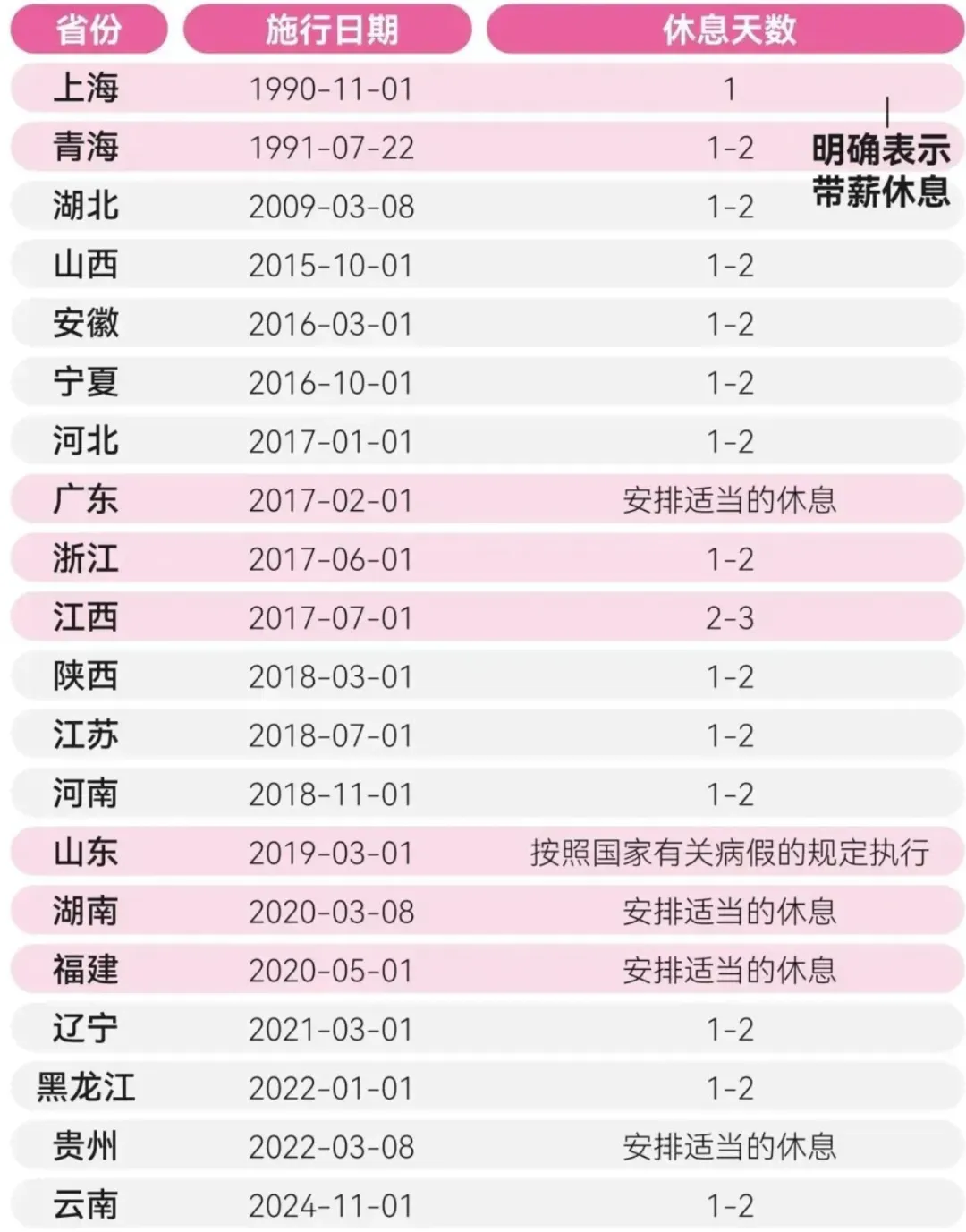 据不完全统计,目前,全国已有包括北京、上海、广东、浙江、云南等约20地,在地方性规定中明确了女性劳动者的这一权益,休息时间普遍在1—2天,最多的是3天。