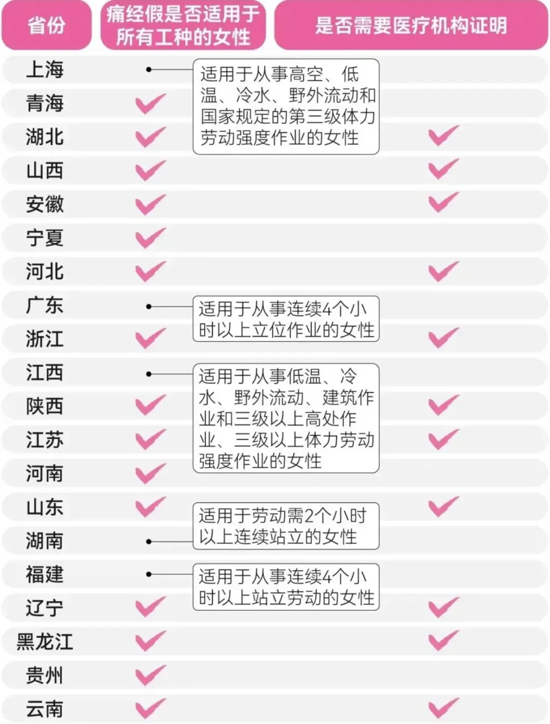 各地“痛经假”的区别主要涉及两个方面:适用的工种范围和是否需要医疗证明。