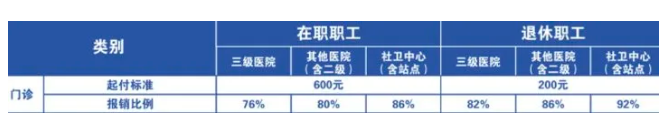 在职职工门诊报销比例在三级医院、其他医院(含二级)、社卫中心(含站点)的报销比例分别为76%、80%和86%